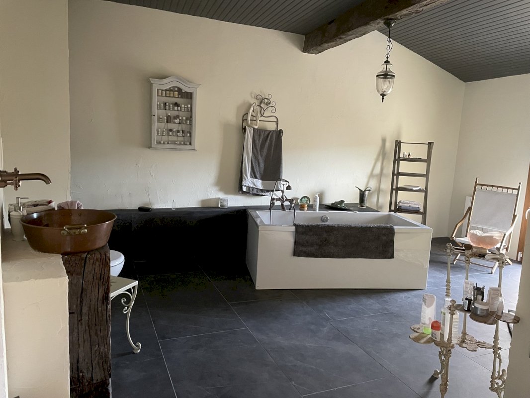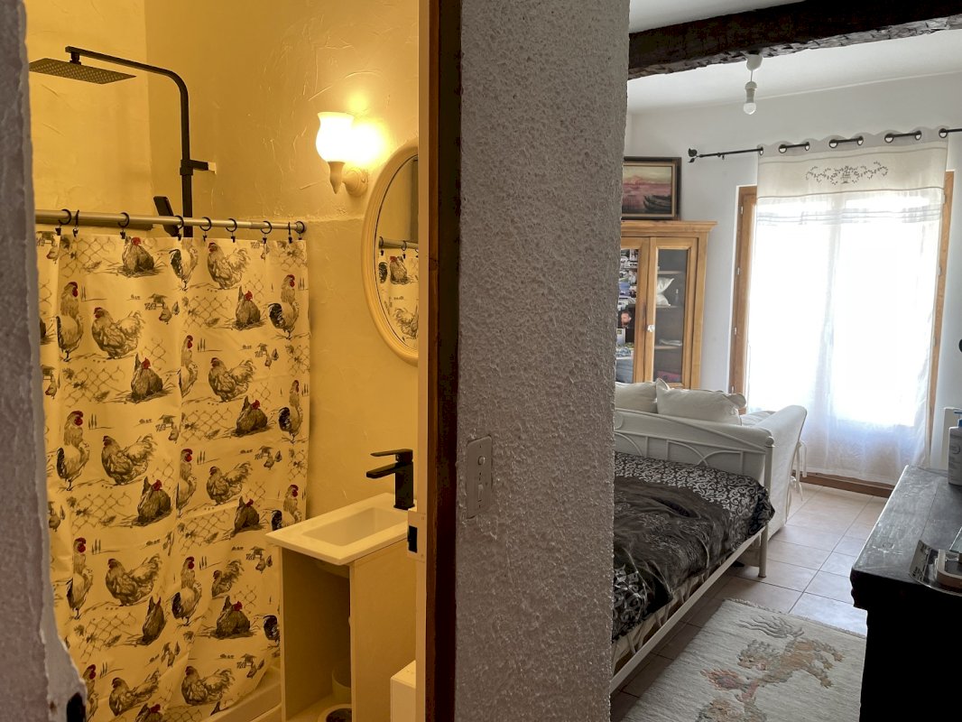 Cette spacieuse maison villageoise orientée plein sud offre un espace vie de 80m² (cuisine intégrée) donnant sur une terrasse de 25m² ainsi qu'une chambre et sa douche attenante donnant aussi sur la terrasse.