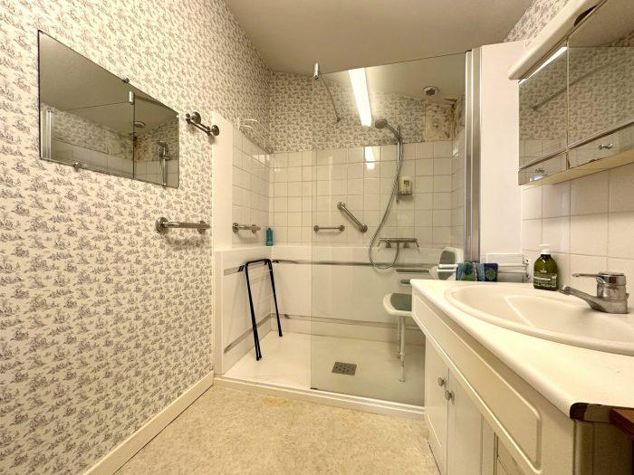 ** Le rdc comprend une entrée, deux chambres, une salle de bain avec toilettes, une buanderie, deux pièces de stockage, un accès au grand garage et un à la cave.