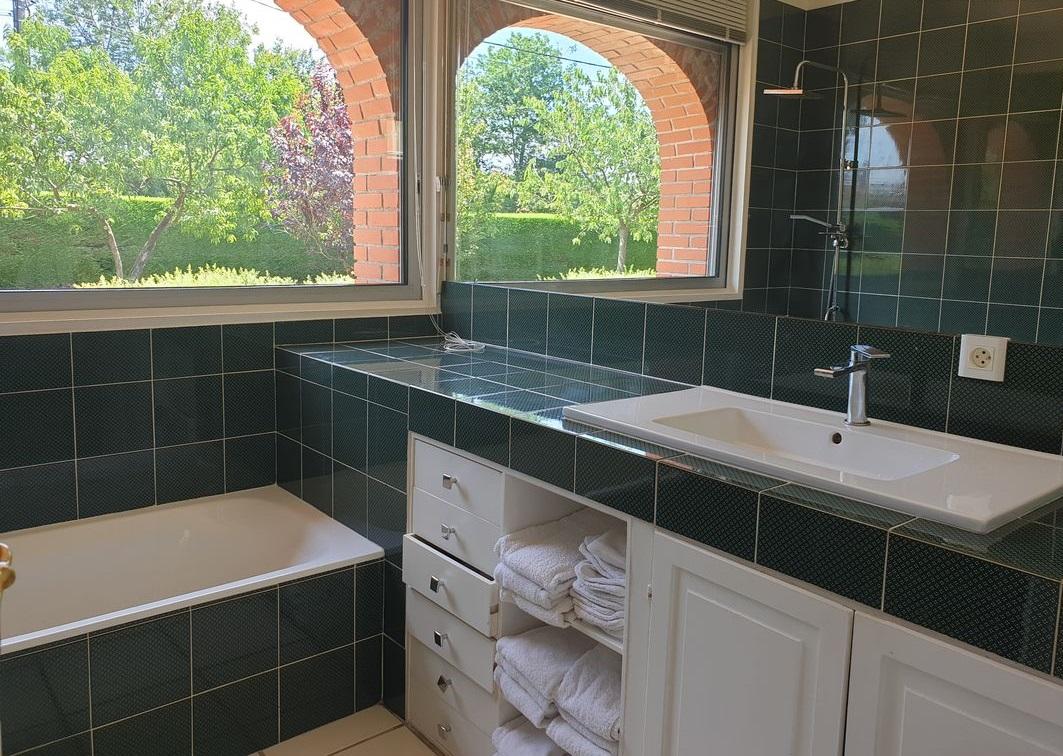 En campagne, au calme, maison de plain-pied construite en 1985 sur le modèle d'un ancien séchoir à briques, 5 pièces plus dépendances aménageables, grand jardin arboré et clos, piscine, 2 garages.