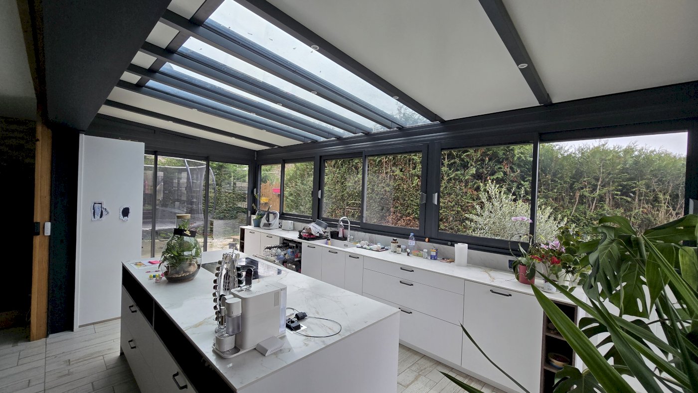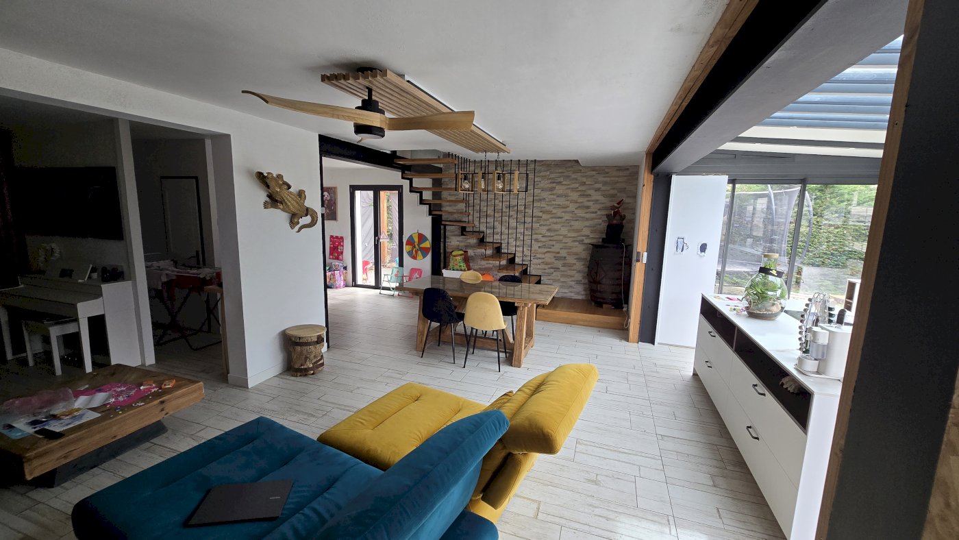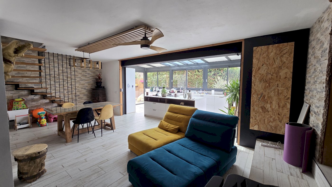 Au rez de chaussé une véranda de 38m² avec la cuisine, donnant sur un grand salon, coin TV, salle de jeu enfants.
