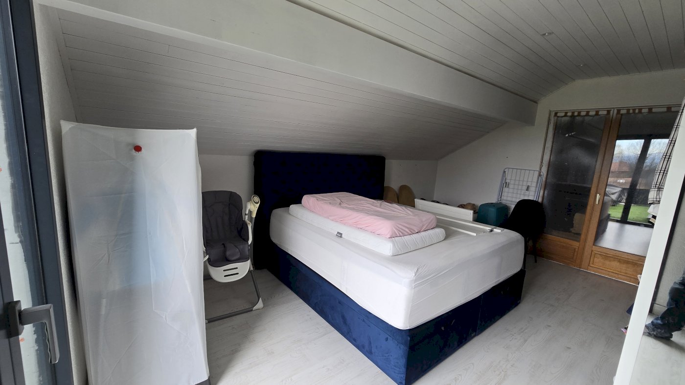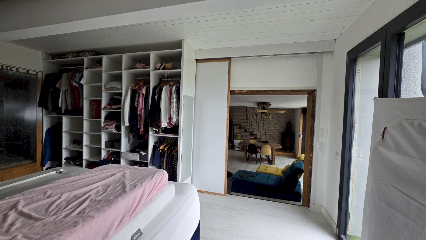Egalement au rez de chaussé sur un niveau légèrement surélevé, une grande chambre parentale avec dressing, donnant sur la futur extension ou une grande salle de bain était prévu.