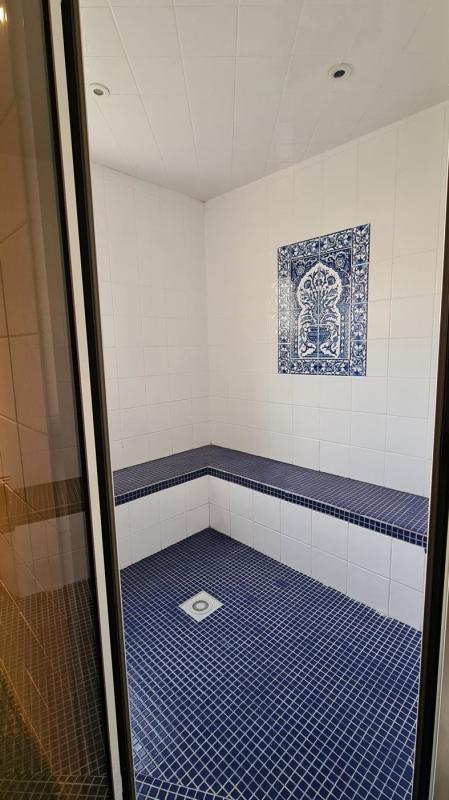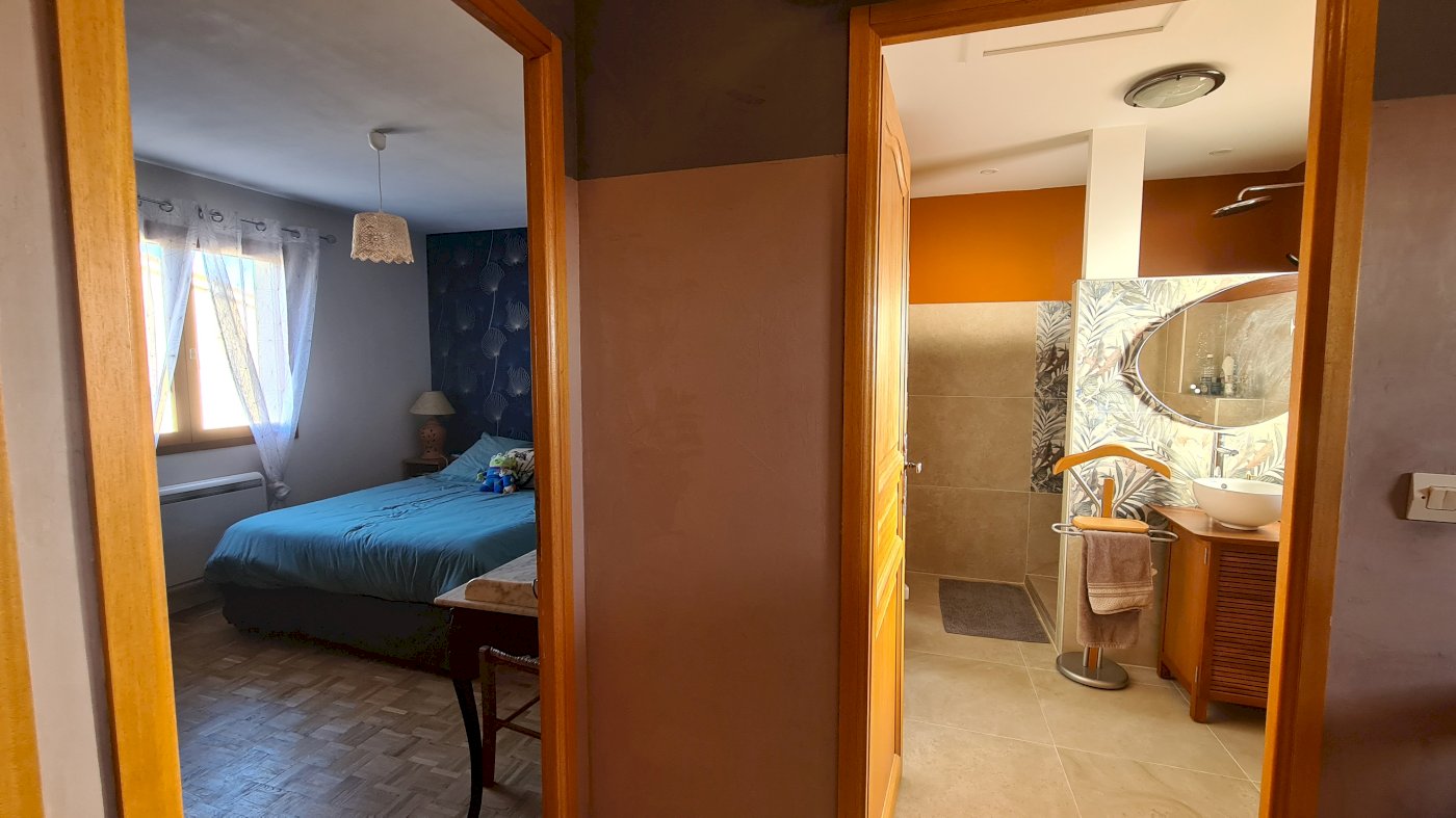 • Au rez-de-chaussée : un hall d'entrée desservant un salon-séjour traversant avec cheminée, une cuisine ouverte, une chambre équipée de rangements aménagés, une pièce lave main ouvrant sur une vaste salle de douche incluant un hammam et des toilettes séparées. Le séjour très lumineux grâce à sa baie à galandage s'ouvre sur une véranda climatisée, plein sud, face à la piscine couverte et sécurisée chauffée par une pompe à chaleur.