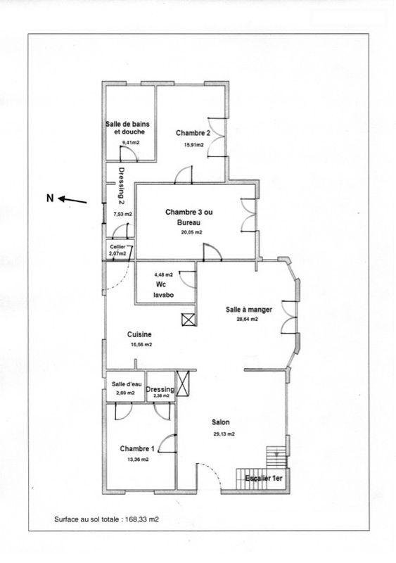 - 1 première chambre (suite) de 13,4 m², orientée ouest, avec sa salle d’eau (fenêtre) et un grand dressing/rangement (2,3 m²).