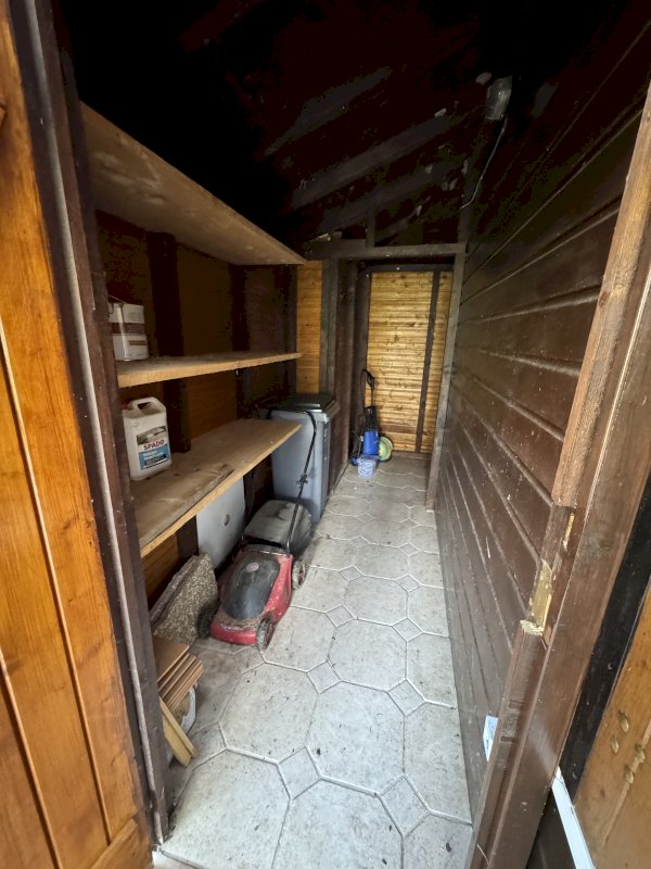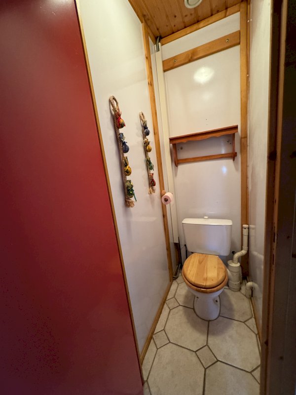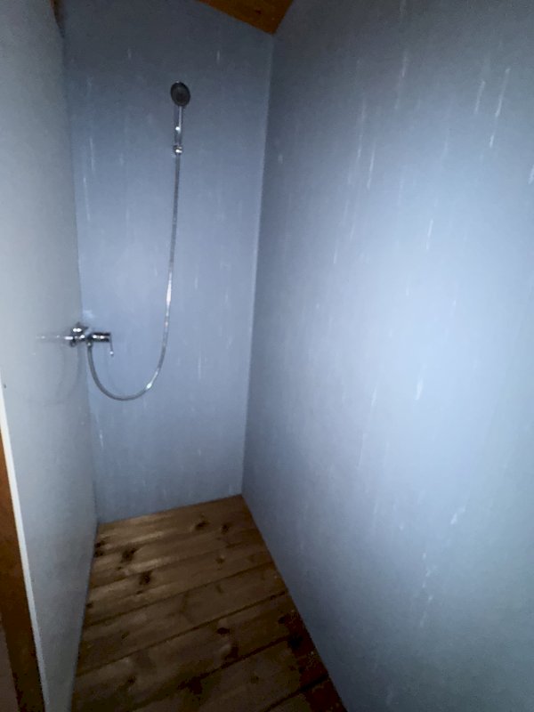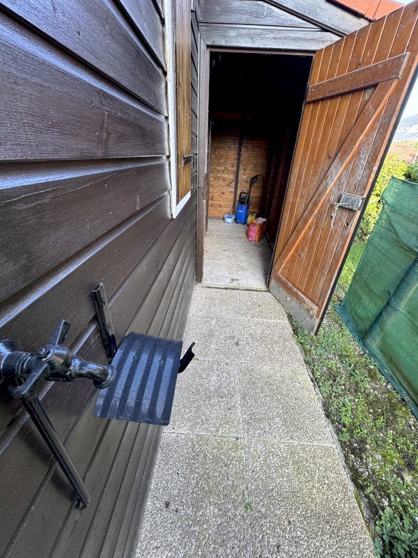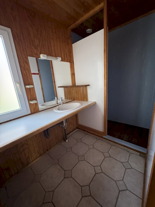 Chalet, comprenant un coin, entrée, une grande pièce principale avec cuisine équipé, constitué de deux chambres, une salle de bain avec douche et lavabo, et d’un WC séparés, à l’extérieur, un cabanon sur le côté du chalet.
