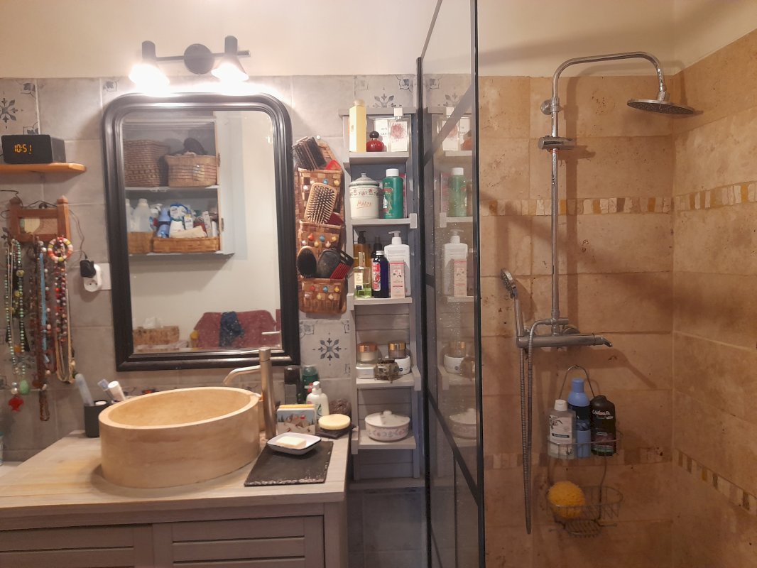 • Au rez-de chaussée: cuisine de 15 m² ouverte sur la cour, salon, cellier, vestiaire, wc/lavabo d'installation recente, cave de 12 m².