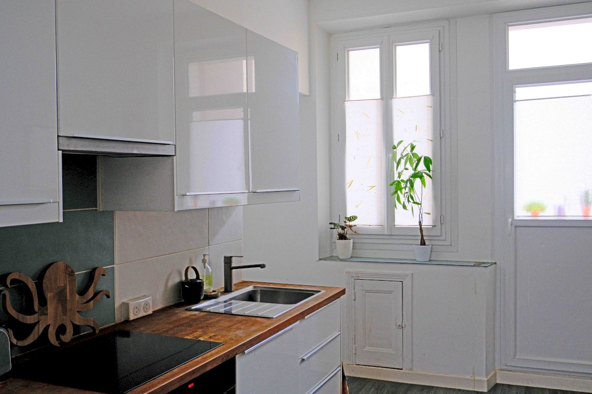 • Cuisine équipée avec plan de travail en bois massif chêne, donnant sur un petit balcon d’une cour intérieur