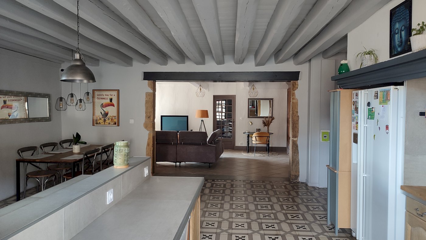 Sur le charmant village de Saint-Loup (commune de Vindry-sur-Turdine), à 2 minutes de l'autoroute A89, vous serez sous le charme de cette petite copropriété en pierres dorées. Ce bien très spacieux de 132 m² (127 m² Loi Carrez) est composé d'une magnifique pièce de vie de 64 m² avec cuisine équipée rénovée et un bel espace salon. L'ensemble est chauffé par un performant poêle à granulés.