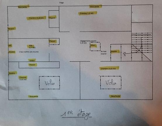 ETAGE: 3 chambres , un WC, lavabo avec possibilité d'installer une douche et une pièce rangement.