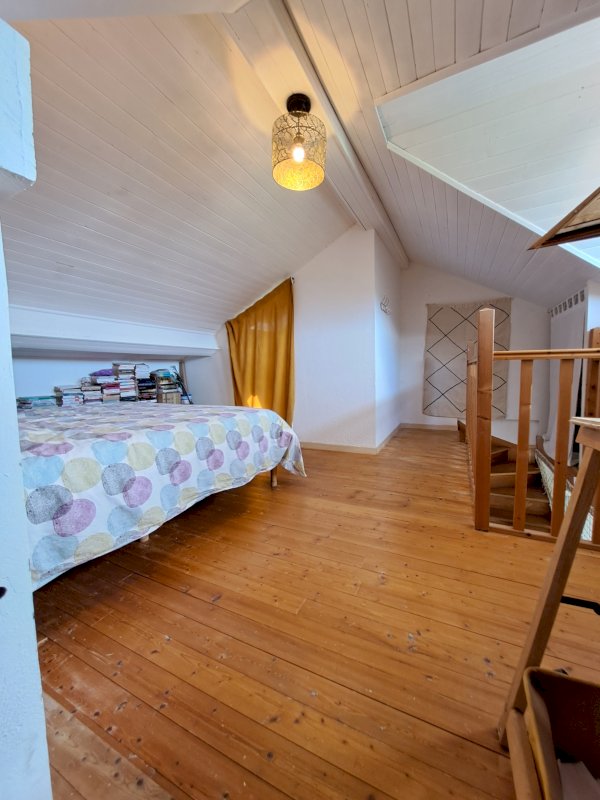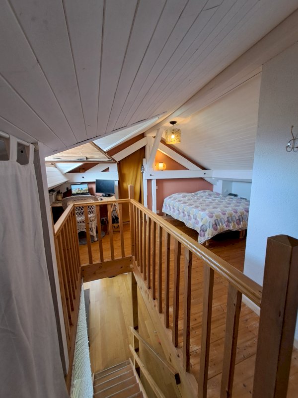 A l'étage, une chambre mansardée séparée d’une salle d'eau et toilettes, puis une pièce dédiée au rangement.