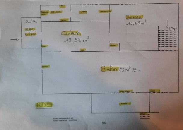 RDC: cuisine, salon, pièce/ bureau et WC avec baignoire sabot.