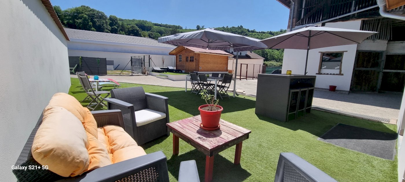 A l’extérieur, un grand garage avec double porte sectionnelle isolante de 45 m2 + étage de 41 m2, un chalet de 15m2 avec un spa 6 personnes, piscine hors sol Intex de 7m32x3m66x1m32 et son local technique, terrain de pétanque, deux chenils confortables, une dépendance de 50 m2 servant de chaufferie et d'atelier et une grande dépendance de 140 m2 au sol composé de 6 box avec abreuvoir, râtelier et électricité. Possibilité d'aménager le dessus des box et de l'atelier (stockage, création de gîtes, etc.…). Un terrain plat de 1000 m2 en zone UC avec bassin est clos par un mur de 2m20 de haut en propriété.