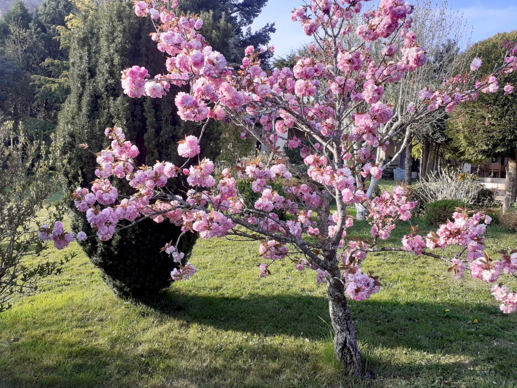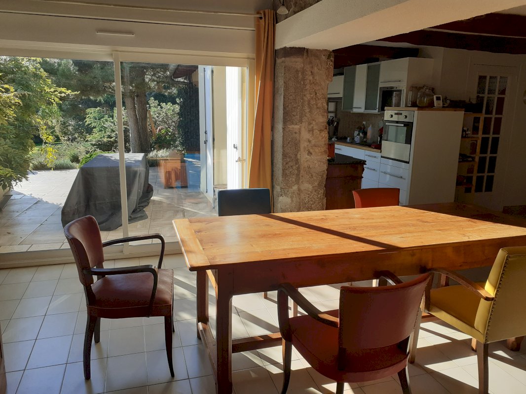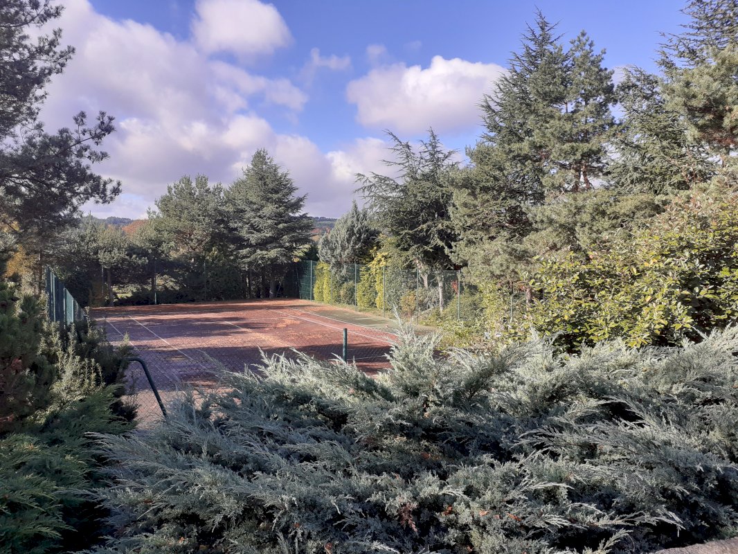 Maison atypique dans grand parc arboré de 3200m² avec tennis piscine hors sol. Toiture neuve sur une partie, peintures extérieures refaites en 2024. Chauffage fioul brûleur Allemand poêle à bois Stuv. Garage plus cour pour véhicules.