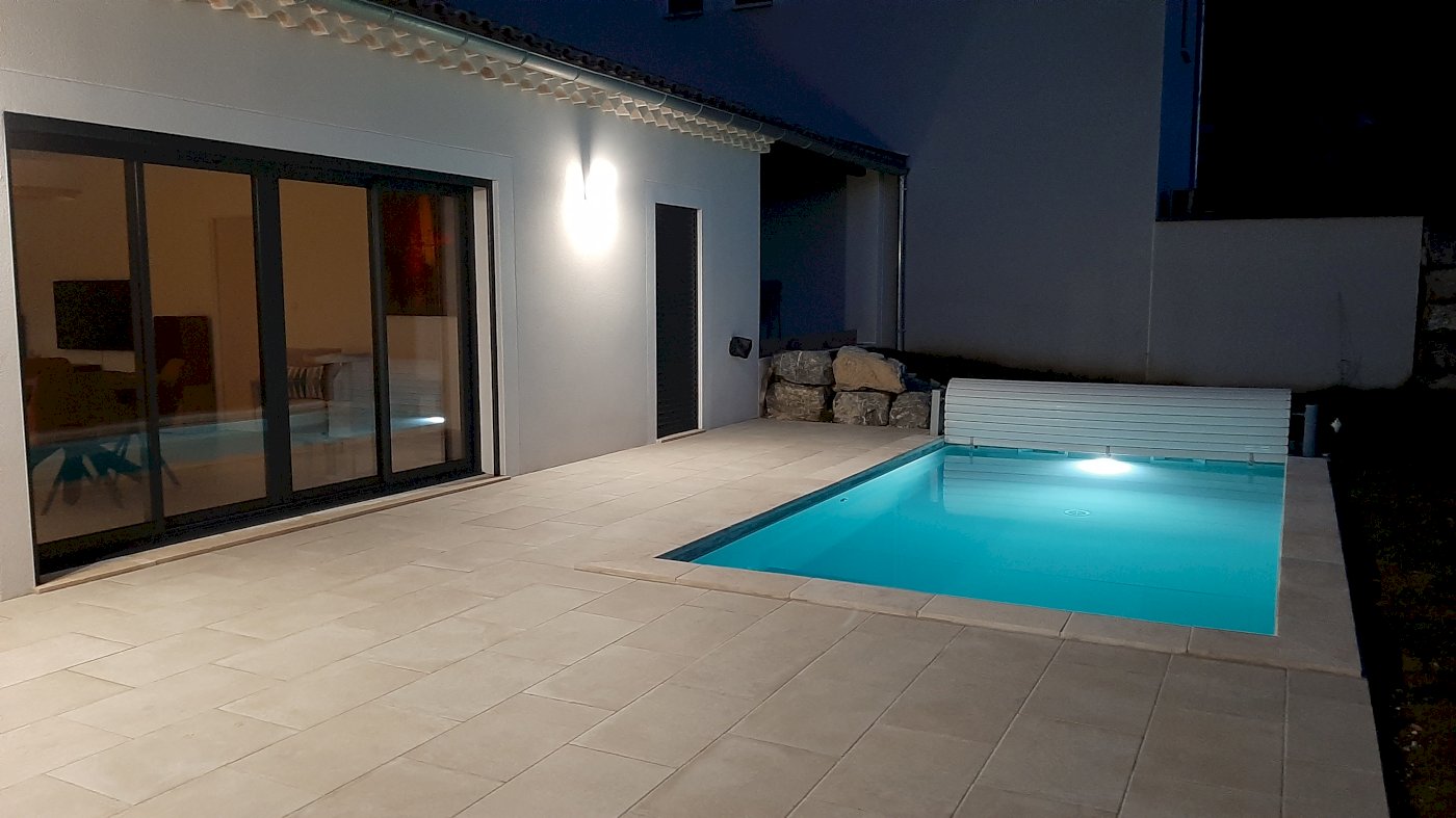 Piscine avec volet roulant électrique et pompe à chaleur, grand garage 42 m² avec local technique, carport voiture.