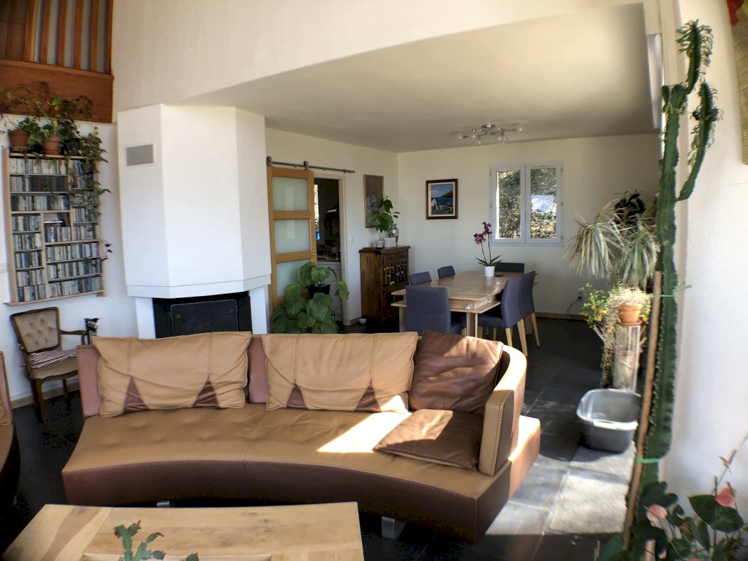 - Un grand séjour – salle à manger avec Cheminée ouverte, larges baies vitrées avec accès de plein pied sur une terrasse.