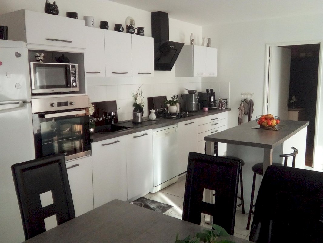 Une grande pièce de vie lumineuse avec cuisine équipée et aménagée, ouvrant sur une terrasse spacieuse