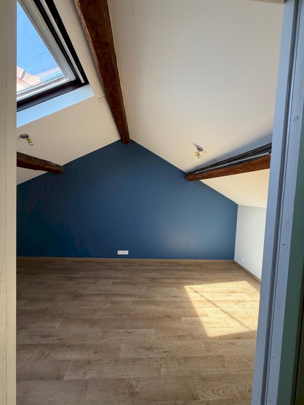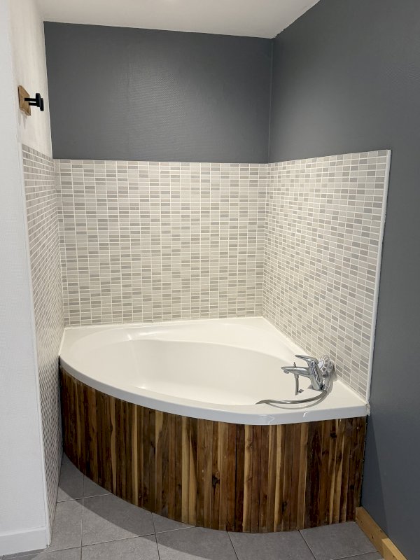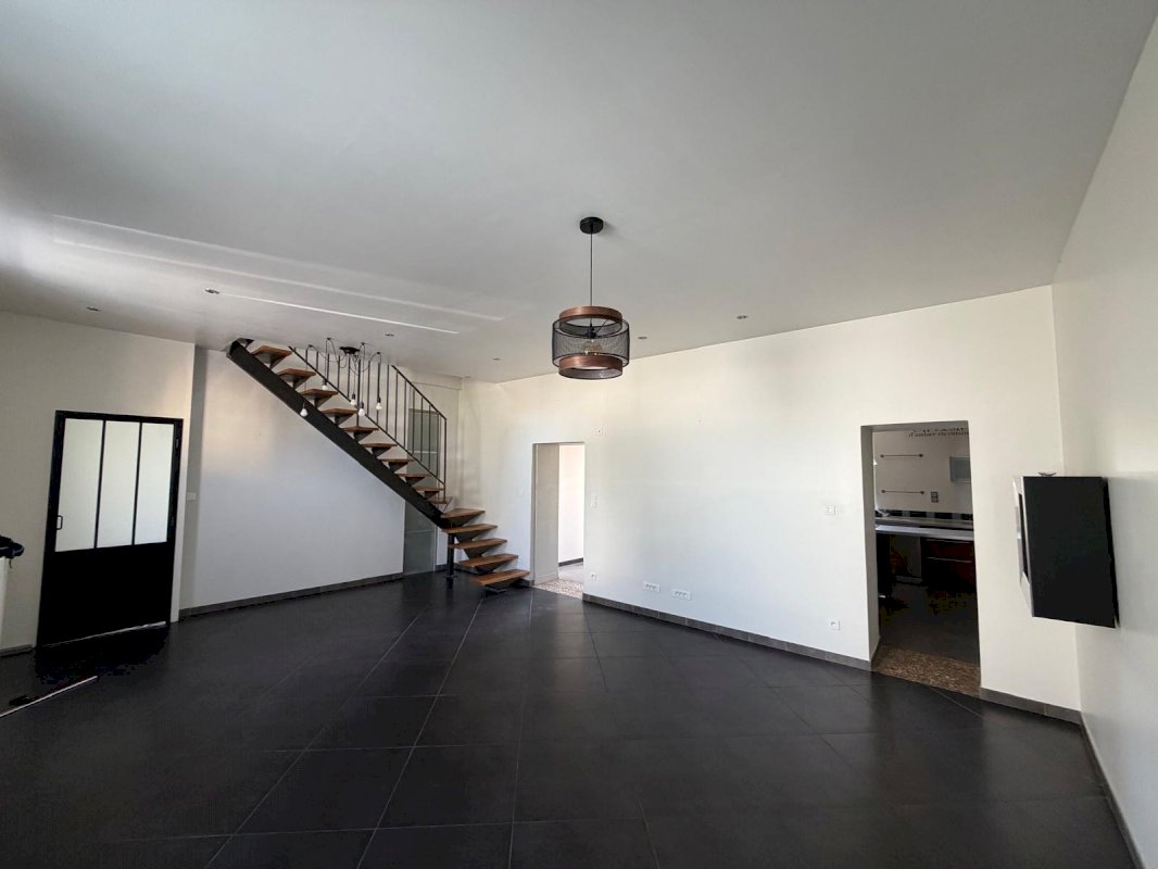 Le rez de chaussée est composé d'un séjour spacieux, une chambre avec dressing, une cuisine équipée avec îlot central, un dégagement ouvert sur la terrasse desservant la salle de bain (douche et baignoire), une mezzanine et un wc.