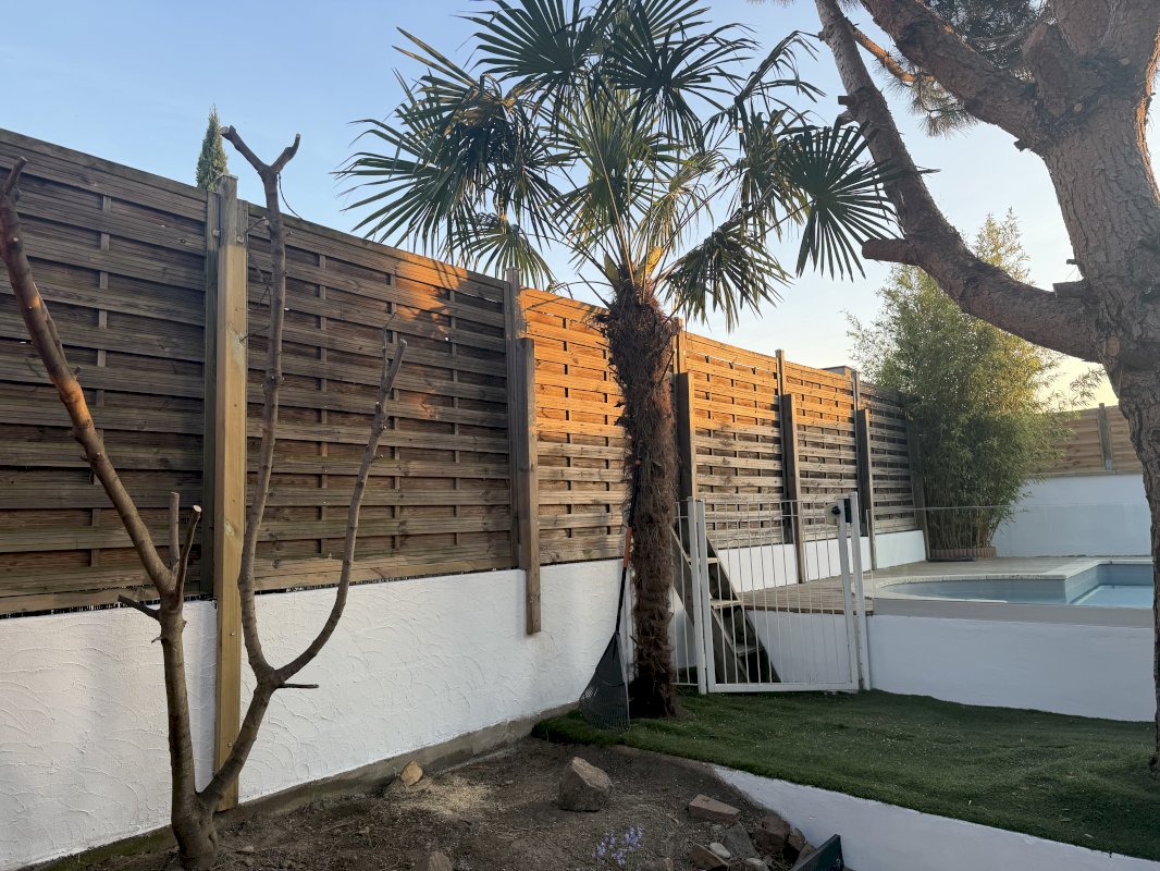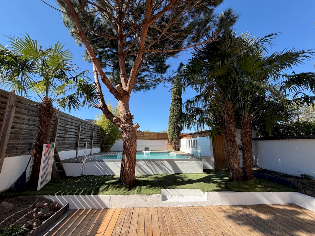 Un jardin arboré orienté sud ouest d'une surface de 150 m², comprend une terrasse en bois, une belle piscine, une dépendance et un espace détente.