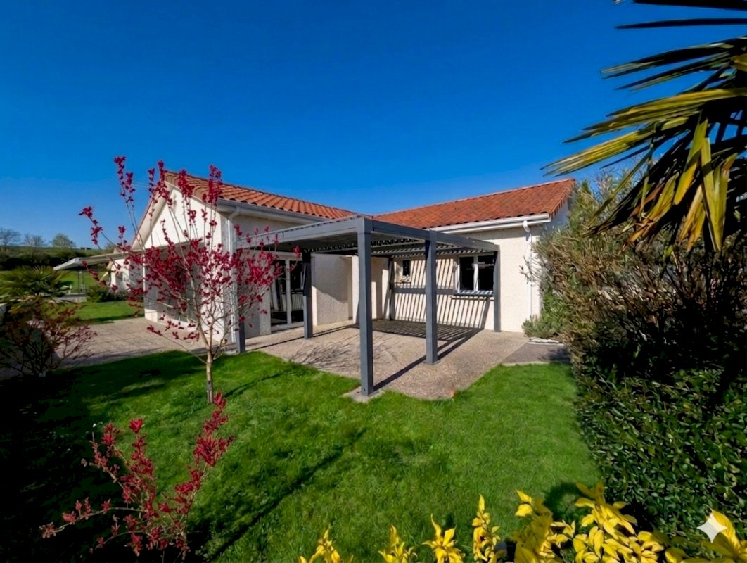 Le terrain de 1000 m² entièrement plat, arboré et clôturé se compose également de 2 terrasses, l'une équipée d'une pergola l'autre d'un store banne.