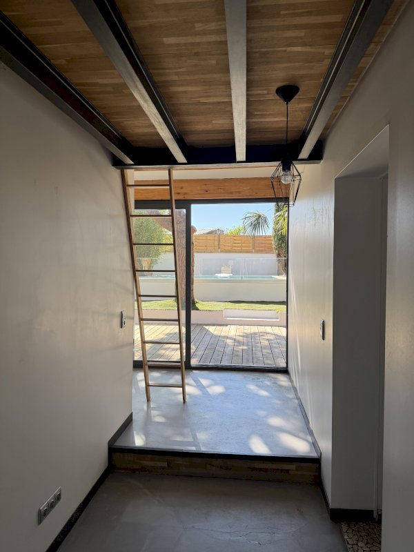 Le rez de chaussée est composé d'un séjour spacieux, une chambre avec dressing, une cuisine équipée avec îlot central, un dégagement ouvert sur la terrasse desservant la salle de bain (douche et baignoire), une mezzanine et un wc.