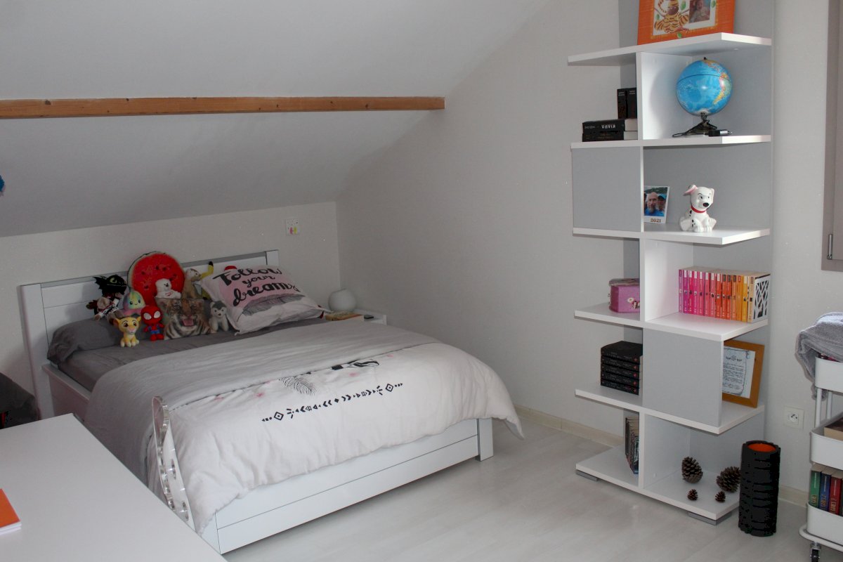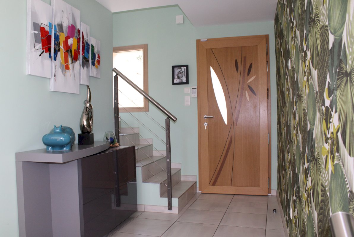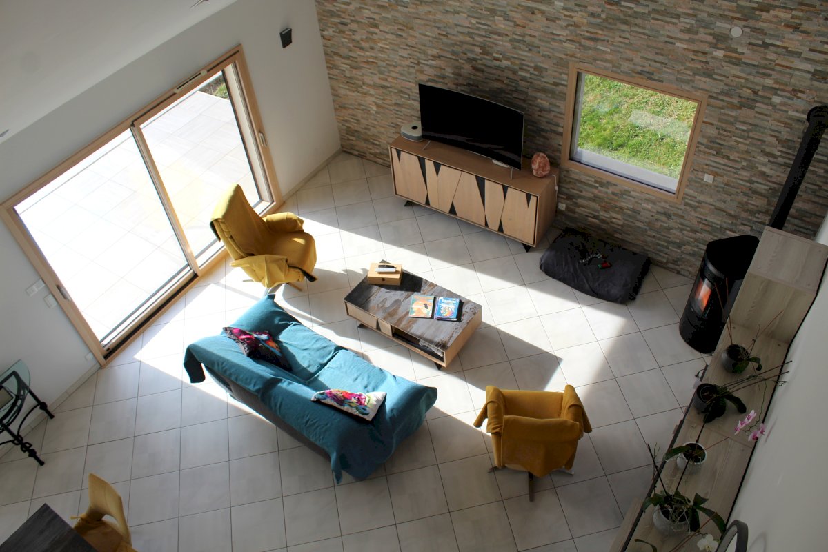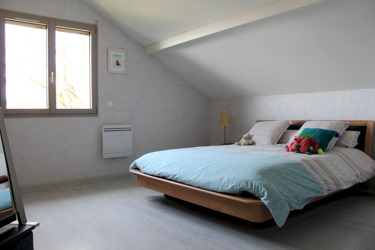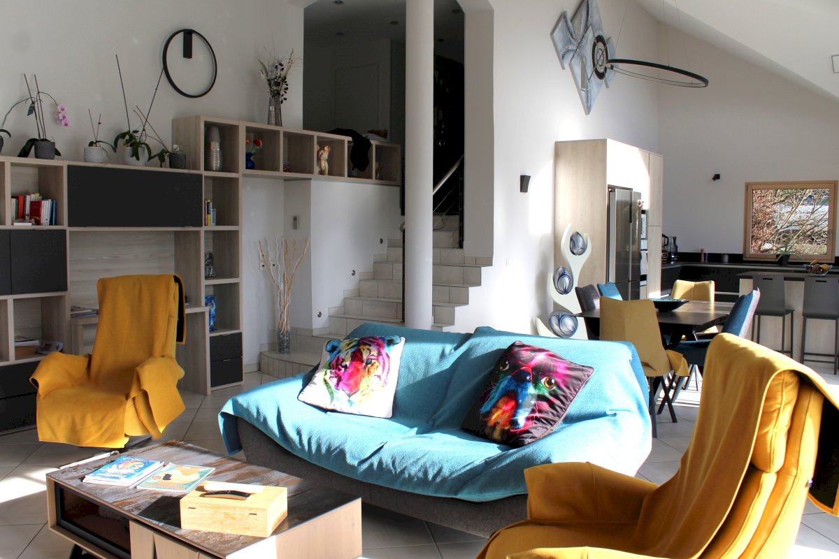 La maison est composé d'un RDC de 61 m² avec salon, salle à manger et cuisine équipée, d'un demi-niveau de 38 m² avec entrée, buanderie, WC et salle de bain et d'un étage de 66 m² composé de 3 chambres, d'une mezzanine et d'un WC. Attenant se trouve un garage de 32 m² isolé avec porte sectionnelle et borne de recharge.