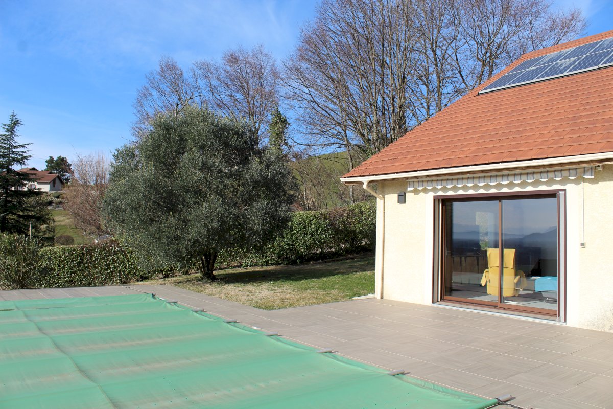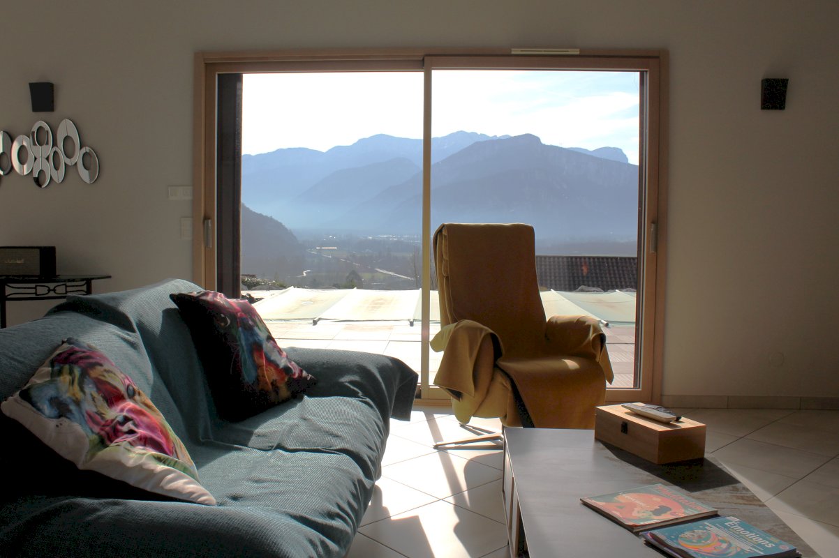 Villa individuelle de 162 m² au sol / 138 m² de surface habitable avec garage de 32 m² sur terrain de 1500 m2 avec piscine enterrée 8 m x 4 m et vue sur le massif du Vercors.