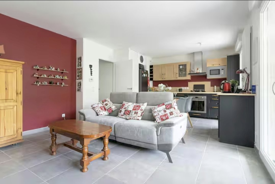 Pièce à vivre avec cuisine ouverte et équipée, lumineuse, donnant sur une terrasse de 17m².
