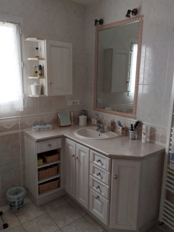 1 Salle de bains avec baignoire et douche, radiateur sèche serviettes.