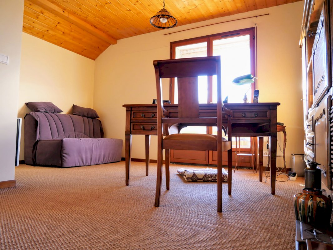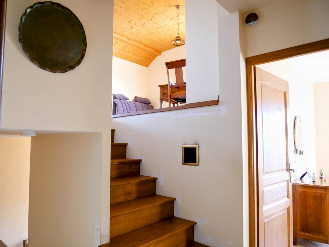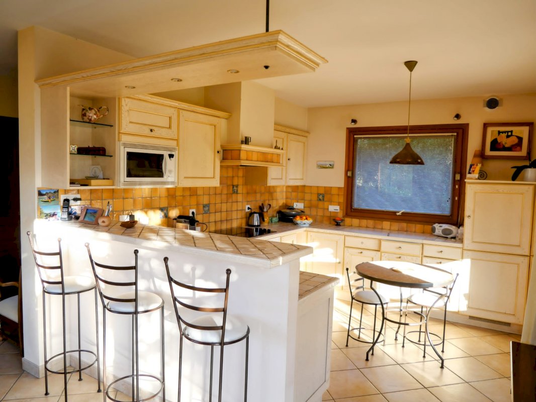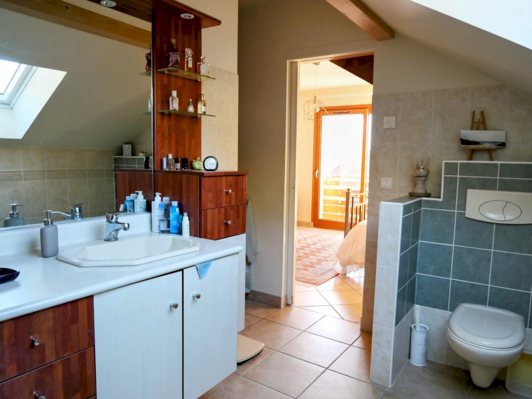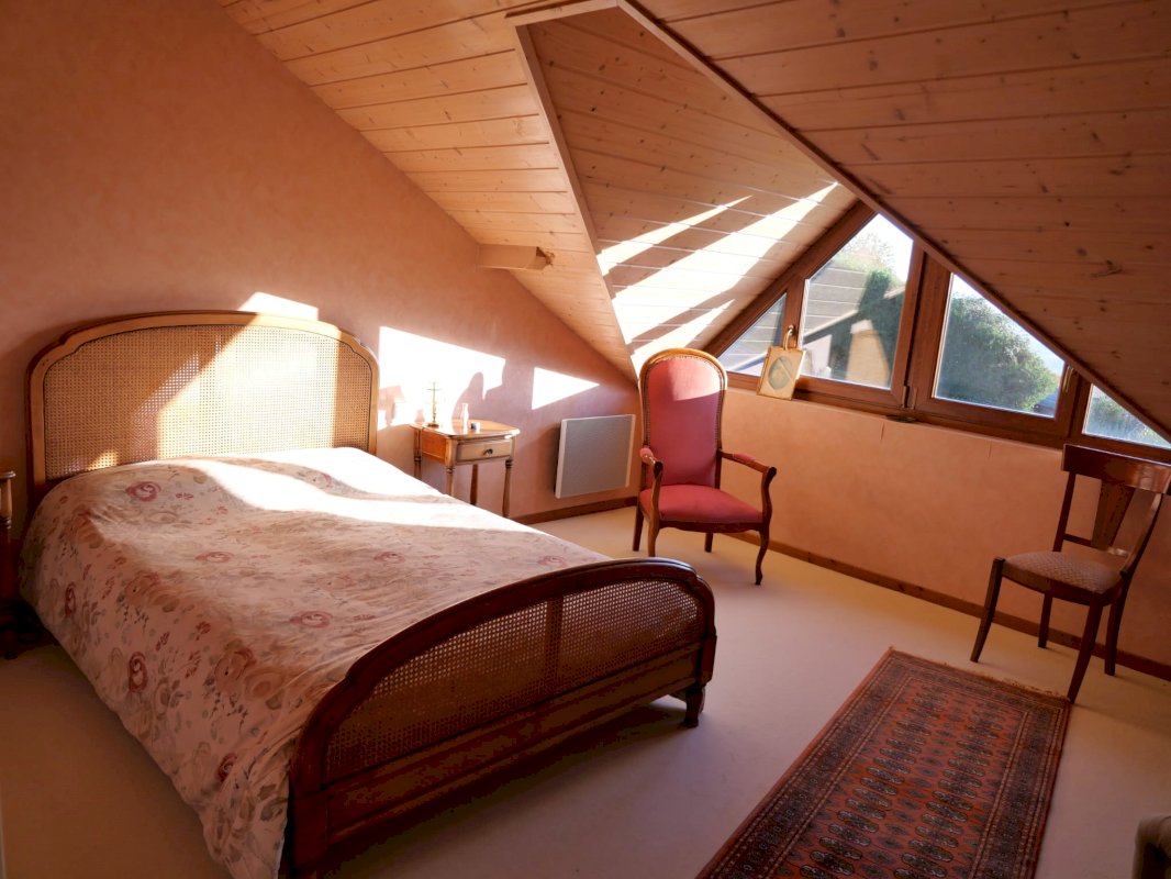 La villa se compose d'un rez de chaussée de plain pied donnant sur une terrasse extérieure pavée. L'entrée se fait par un vaste hall avec vestiaire et WC indépendant. Ce hall dessert une belle pièce à vivre comprenant une cuisine aménagée ouverte sur un coin repas et un salon agrémenté d'une cheminée avec insert. En demi niveau on retrouve une grande suite parentale comprenant une salle de bain avec baignoire et WC ainsi qu'un dressing. A ce niveau se situe également une buanderie. Le 1er étage s'ouvre sur un vaste bureau avec balcon (transformable facilement en 3e chambre), une chambre et une 2e salle de bain avec douche et WC.