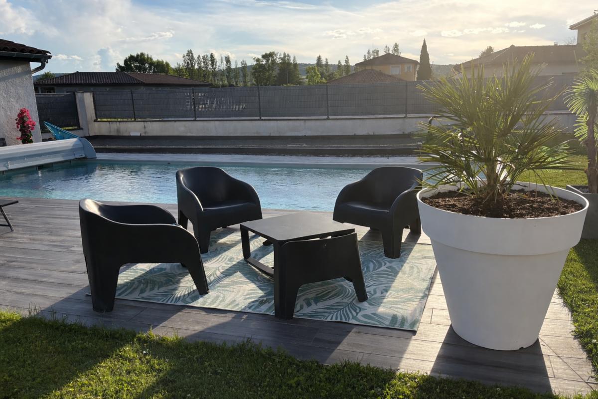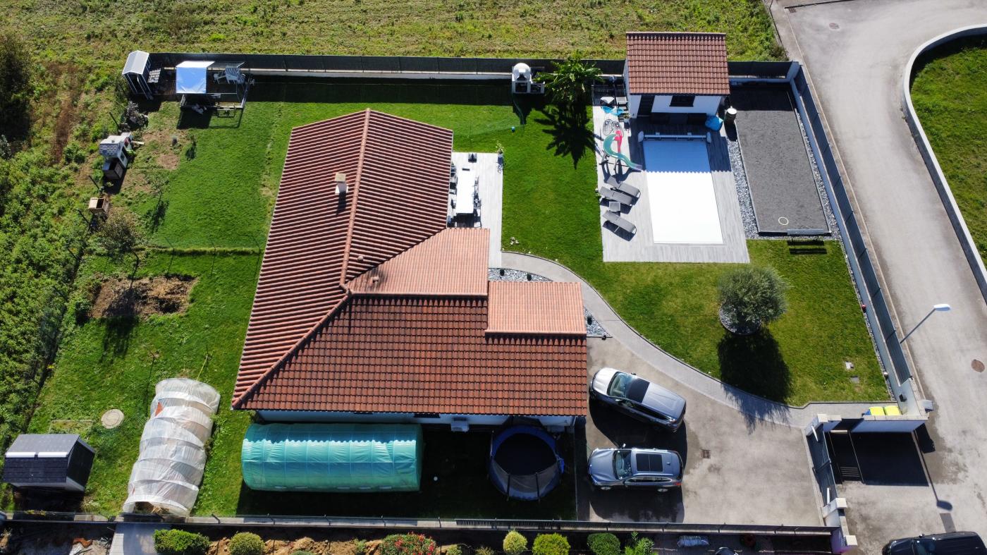 Salon très lumineux exposition sud, est, ouest, cuisine fermée (schmidt), cellier, chauffage PAC eau/air, clim réversible (2 splits couloir + salon), piscine chauffée, pool house (douche + wc), terrasse avec pergola bioclimatique Gustave Rideau (avec rideau anti UV côté est), four à bois, jardin, terrain de pétanque, garage. Terrain plat 1300 m² entièrement clôturé. Lotissement pas en bord de route.
