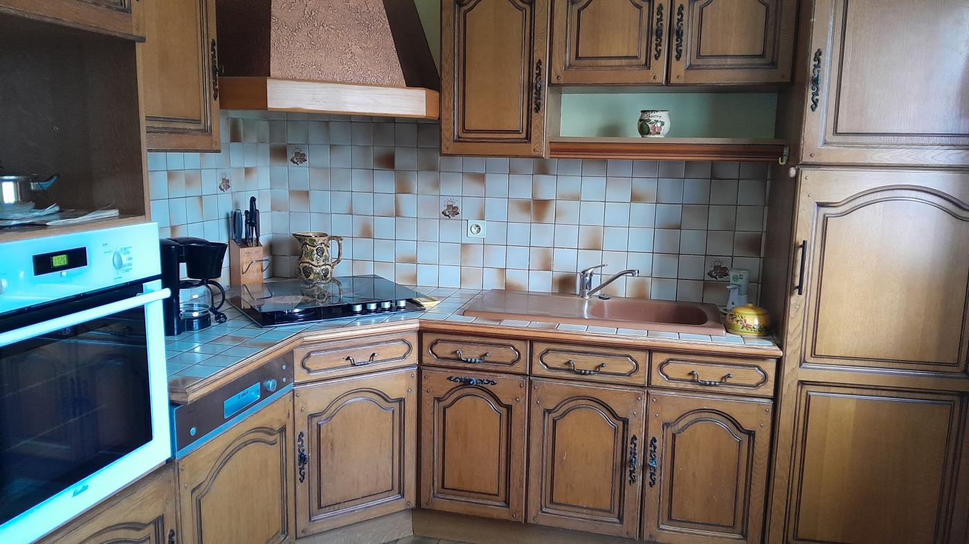A L ETAGE : une cuisiné aménagée , un salon/ sejour/ salle a manger avec insert bois donnant sur un balcon