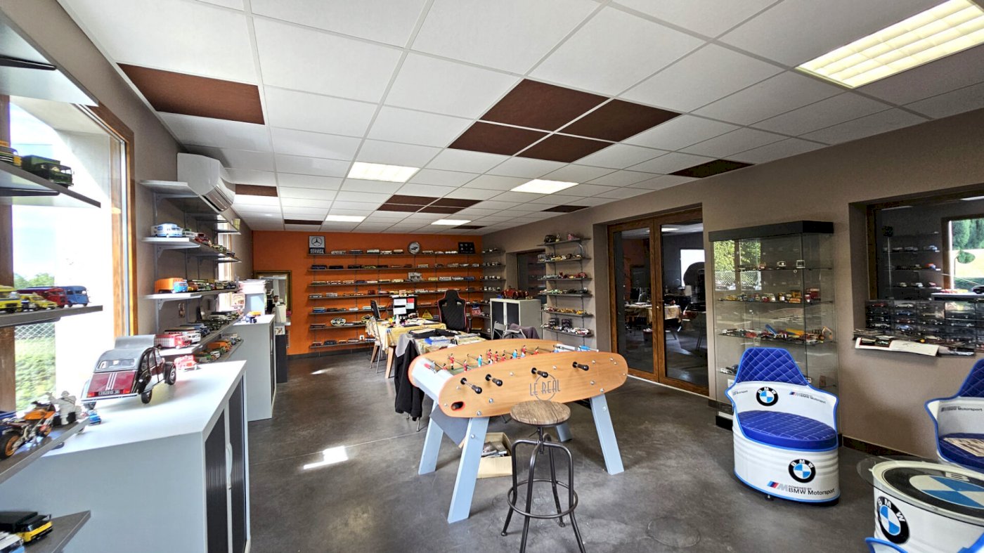 Un garage de 250 m² construit il y a 3 ans en béton banché avec une pièce de vie de 50 m² habitable isolée, chauffée et climatisée, par pompe a chaleur , cuisine... La partie atelier est équipée de 3 portes sectionnelles pro électriques et fosse. Avec à l’étage 50 m² de rangement, sol béton avec quartz couleur gris anthracite. Ce bâtiment peut être mis à la location pour une somme de 1500€/mois par les nouveaux propriétaires car il est indépendant de la propriété.