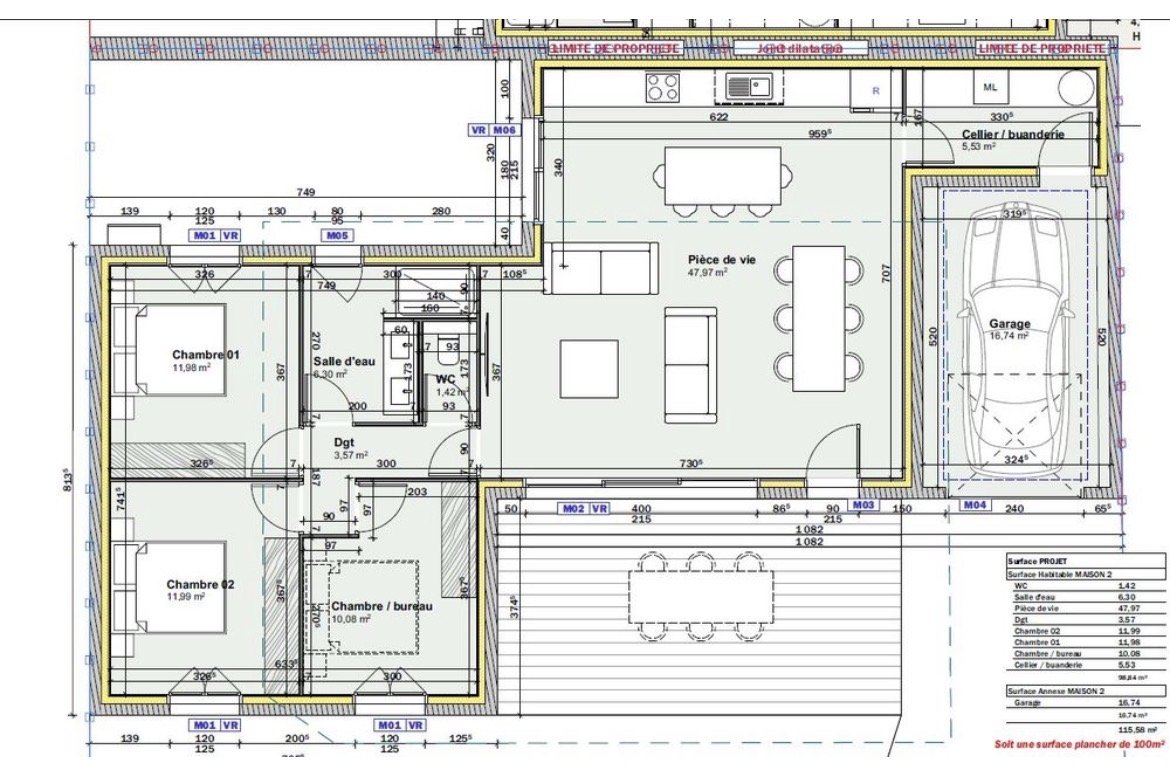 L'habitation offre 100 m² de surface habitable + 21 m² surface annexe (garage, portail électrique). Implanté sur un terrain de 300 m².