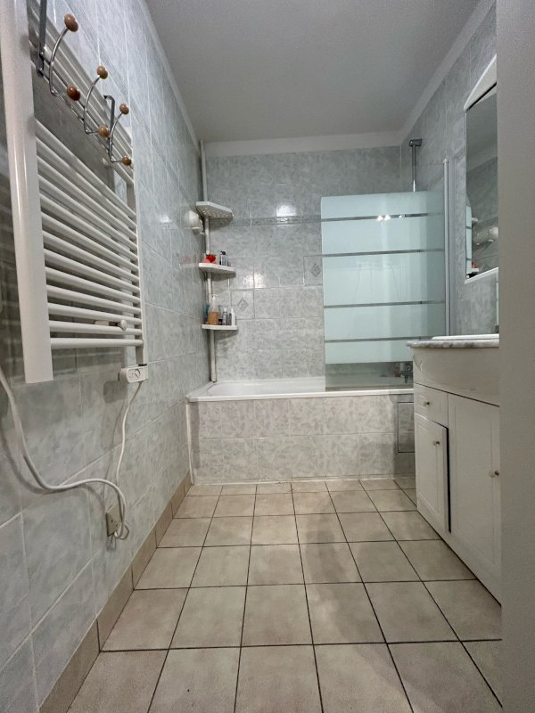 - 1 salle de bain avec baignoire, meuble vasque et sèche serviette électrique