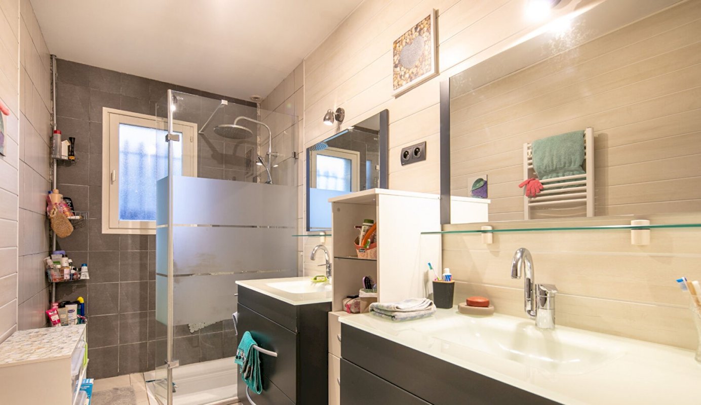 Une salle d'eau avec douche et deux vasques