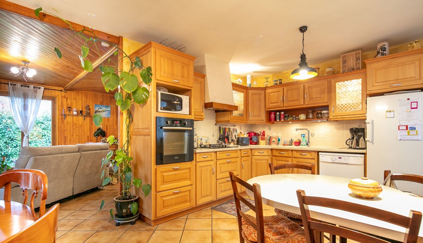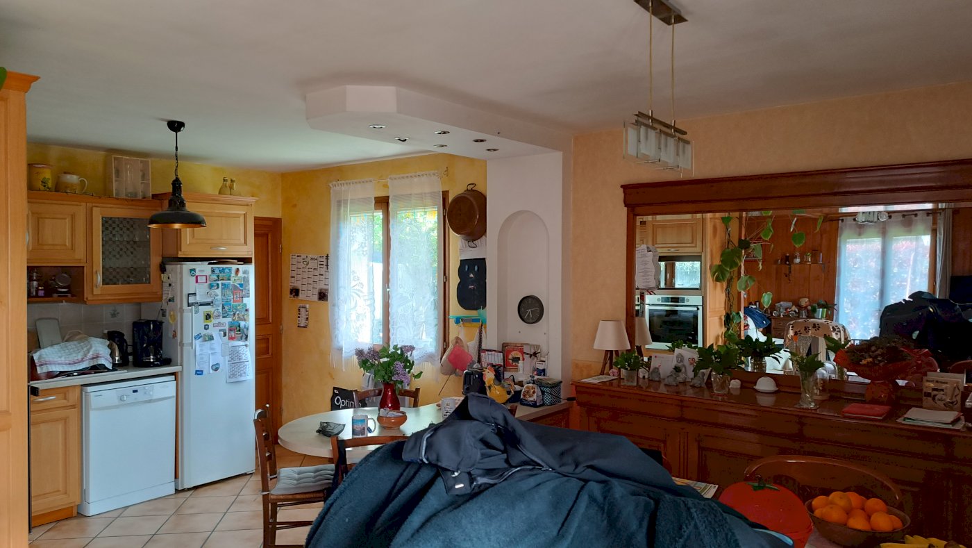 Un grand espace salon de 23m² donnant un accès direct sur une salle à manger de 12m² et une cuisine aménagée de 11m², accès sur une terrasse couverte.