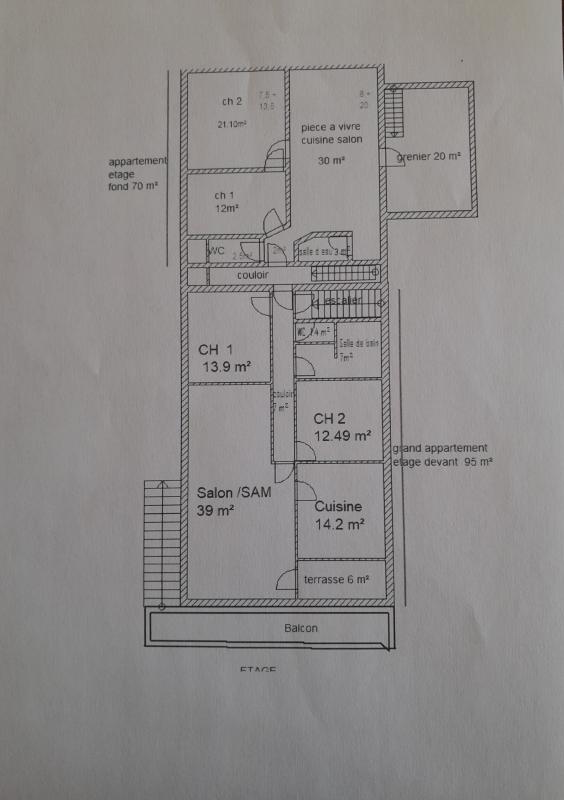 comprenant 1 appartement principal de 98m² à l'étage, avec grand salon, terrasse, cuisine, 2 chambres 13m², possibilité 3, wc sdb.