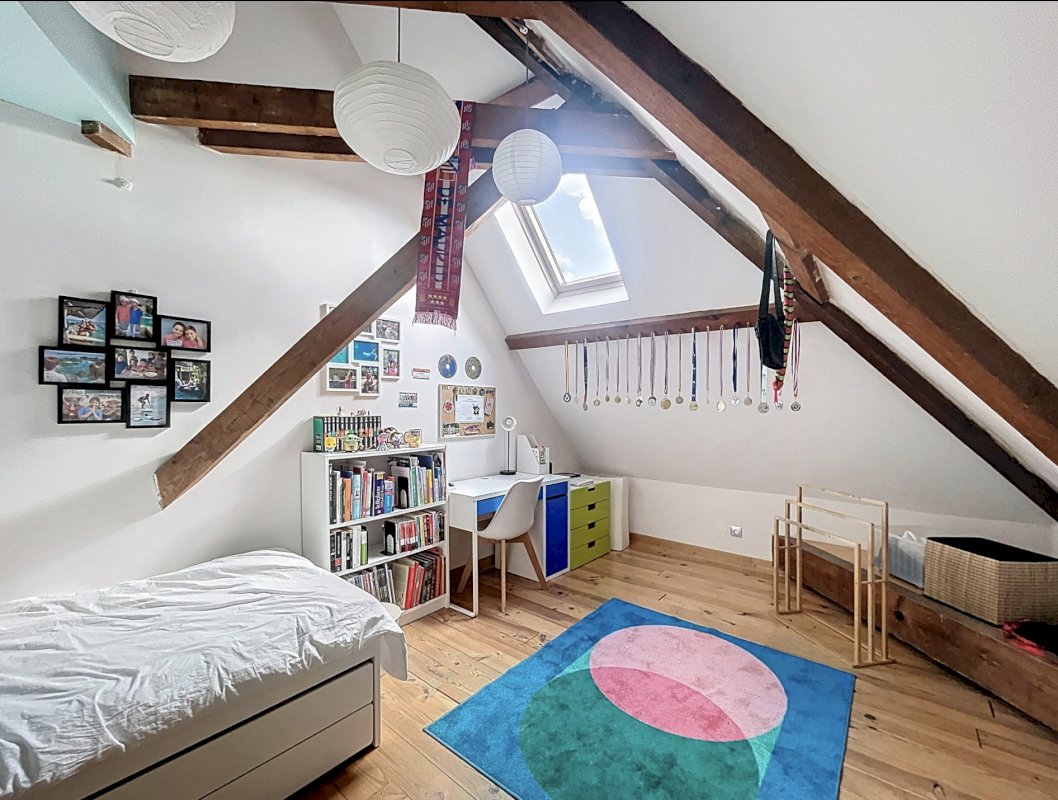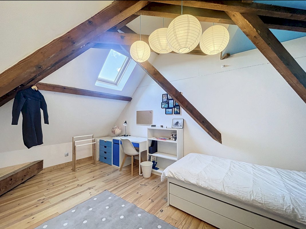 Les anciens combles ont été aménagés en conservant les poutres apparentes et la hauteur sous plafond. Cet étage accueille un salon TV/jeux, une salle d'eau avec WC, 2 chambres, un bureau (ou chambre supplémentaire selon vos besoins) et une buanderie.