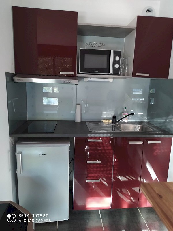 Il est équipé d'une vaste pièce de vie (22 m²), d'un espace cuisine équipé ouvert sur le séjour. La salle de bain est dotée d'une baignoire.