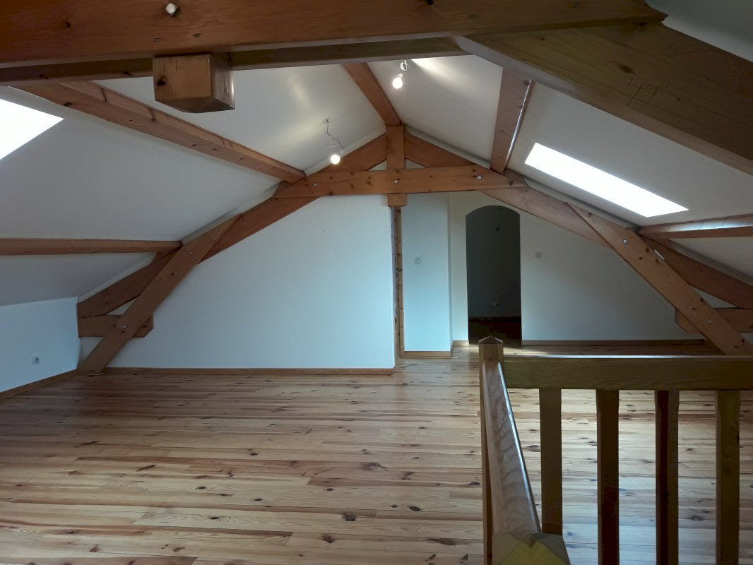 Au 2ème étage : un espace sous le toit avec charpente traditionnelle apparente composé d'une grande salle avec velux de 46m² dont 23m² loi carrez, d'une chambre avec velux de 16m² dont 9m² loi carrez et d'un bureau de 7.5m².