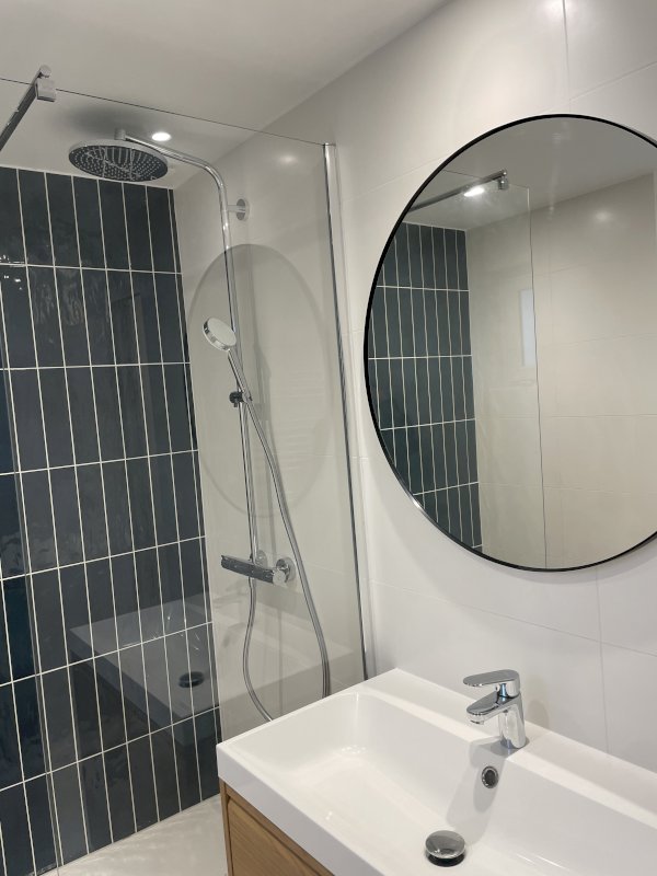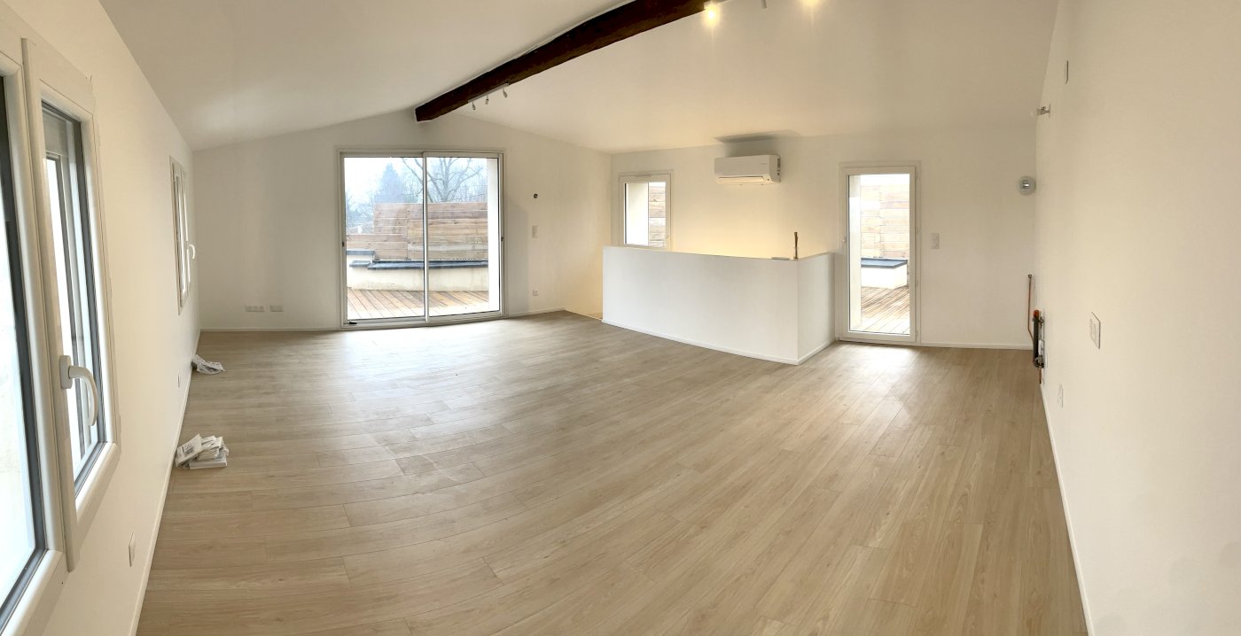 Au second et dernier niveau, spacieuse pièce à vivre équipée d'une Clim réversible, d'un bel espace cuisine, donnant accès à une magnifique terrasse bois sans vis à vis.