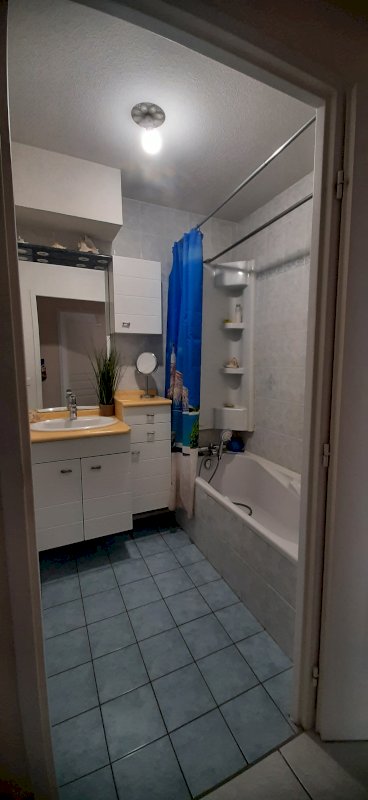 • Salle d’eau avec sèche serviette, grande vasque, miroir, meubles et baignoire dont mur carrelé tt hauteur : 3.54 m²