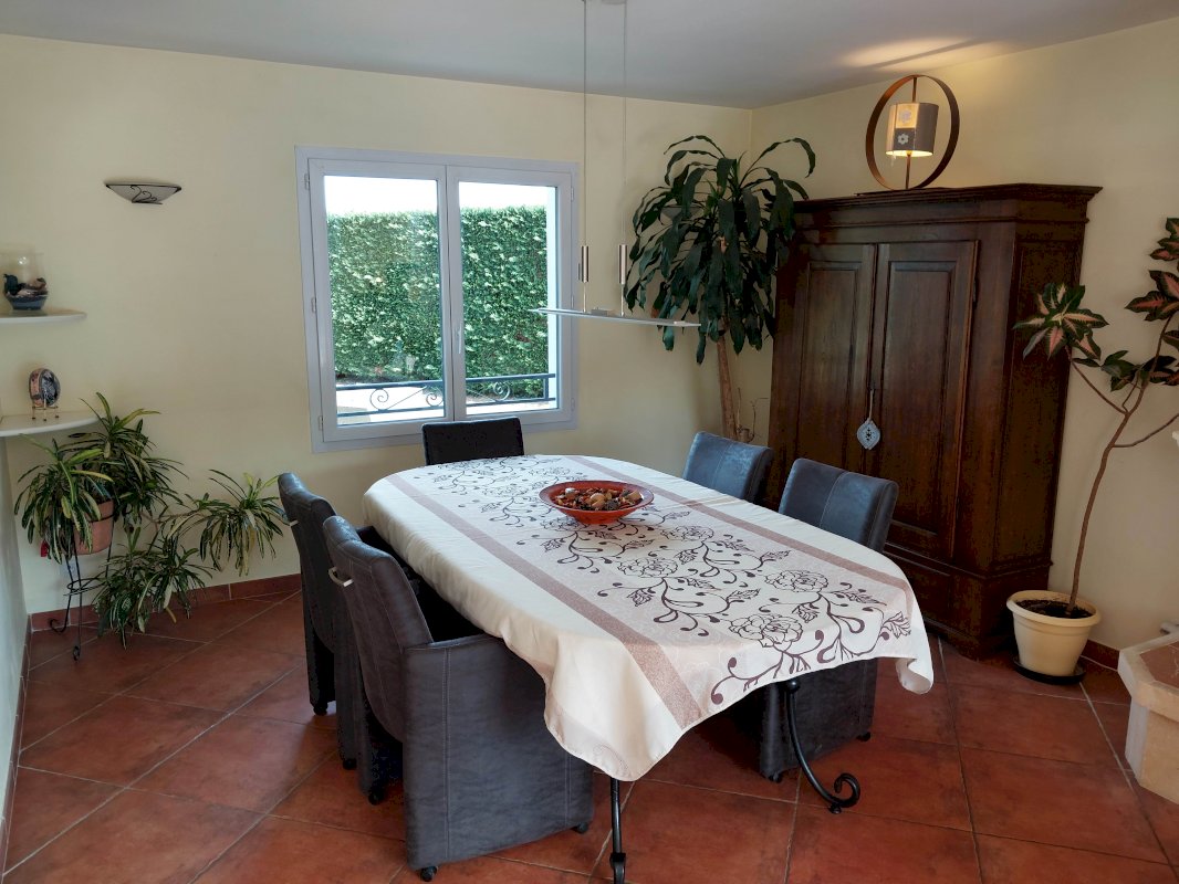 La cuisine est ouverte sur un salon-séjour spacieux offrant, une cheminée à foyer fermé et une luminosité sans pareil, grâce à de grandes baies vitrées exposées plein Sud, permettant plusieurs accès à la terrasse, équipée de 2 stores bannes électriques avec vue directe sur la piscine aménagée 8x4.