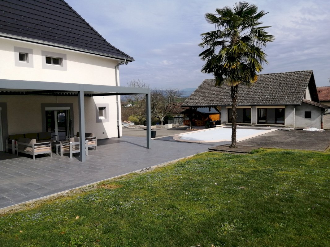 Superbe propriété a vendre sur Chimilin 38490 au calme, sans vis à vis, Entièrement rénovée avec une maison principale de 190 m², garage de 250 m² construction neuve avec 50 m² habitables et un autre bâtiment de 120 m² faisant office de cuisine d'été de 45 m² habitable avec terrasse couverte de 40 m² et pièce aménagée, plus appentis de 35 m².