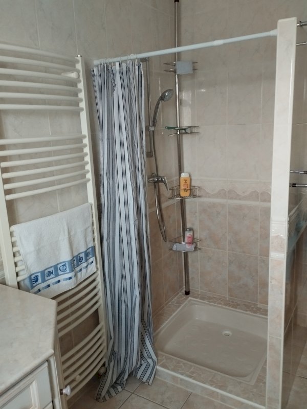 1 Salle de bains avec baignoire et douche, radiateur sèche serviettes.