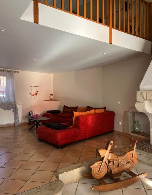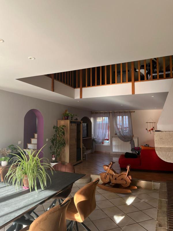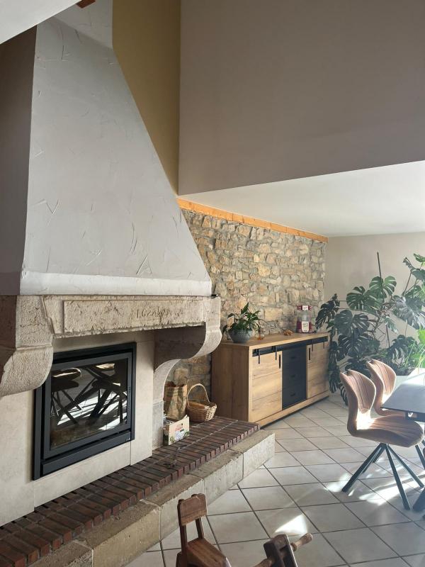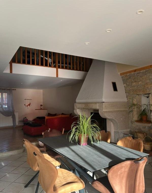 - RDC : cuisine, grand séjour avec cheminée centrale avec foyer fermé donnant sur la mezzanine à l'étage, salon lumineux, garage.