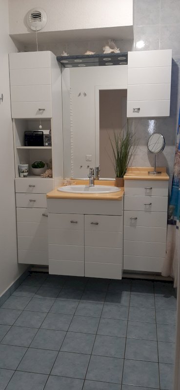 • Salle d’eau avec sèche serviette, grande vasque, miroir, meubles et baignoire dont mur carrelé tt hauteur : 3.54 m²