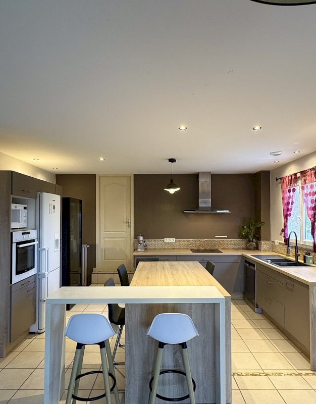 - d'une cuisine équipée à îlot central avec comptoir bar et cellier attenant