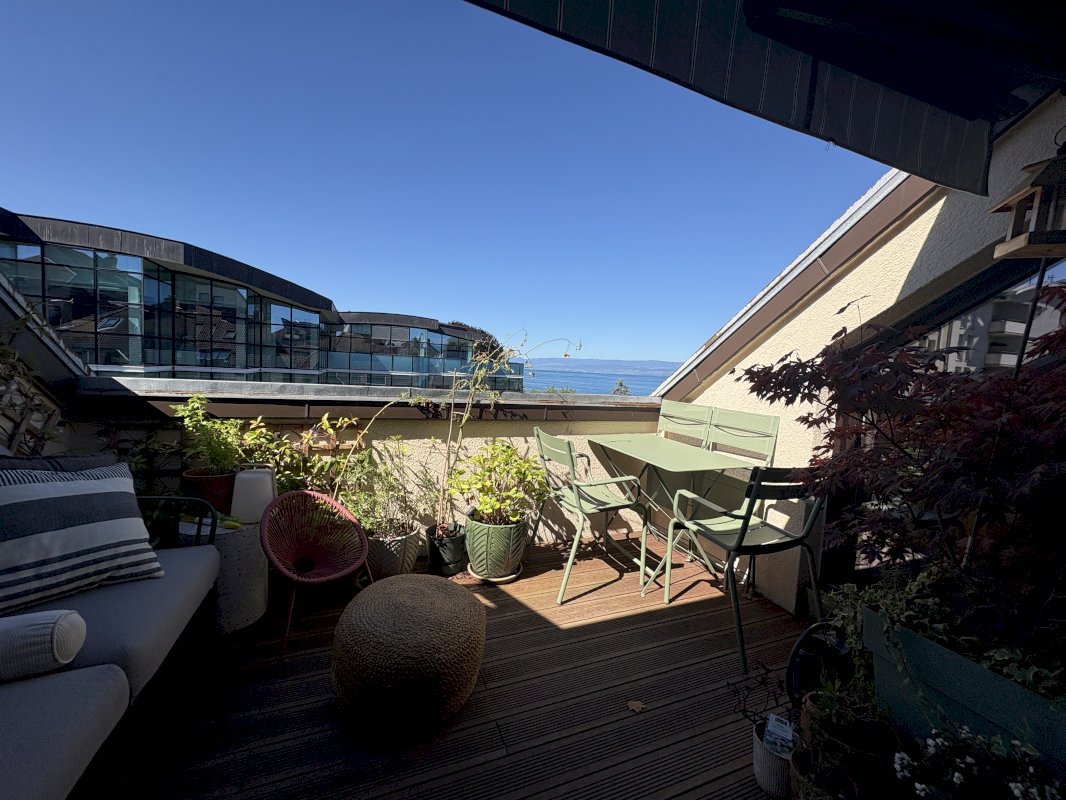 Situé au 5ᵉ et dernier étage avec ascenseur (dernier demi-étage accessible par quelques marches), cet appartement lumineux et traversant offre une vue imprenable sur le lac Léman depuis sa belle terrasse, parfaite pour profiter des couchers de soleil.