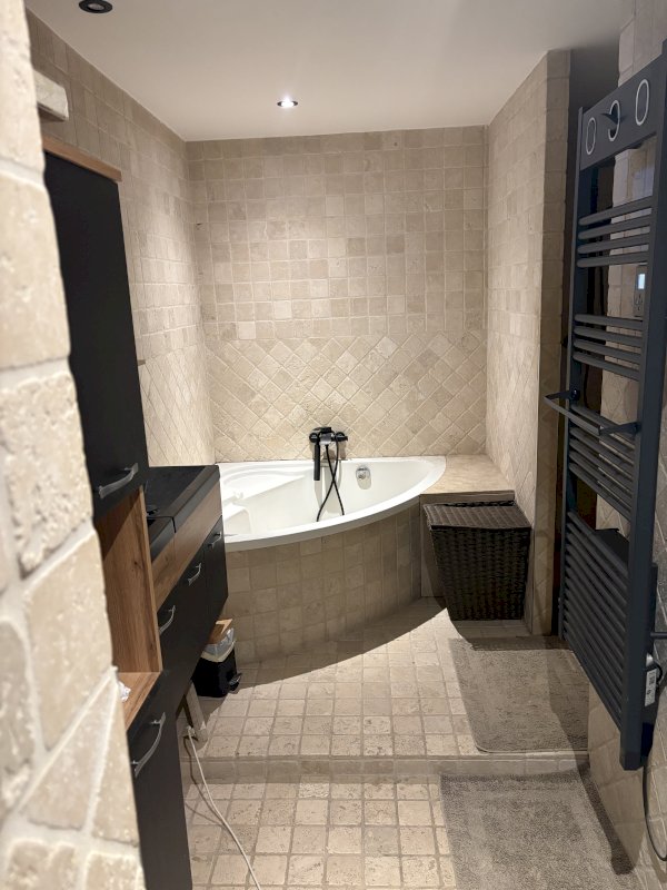 Une salle de bains avec douche italienne, baignoire d’angle et double vasque, un wc indépendant complète ce niveau.