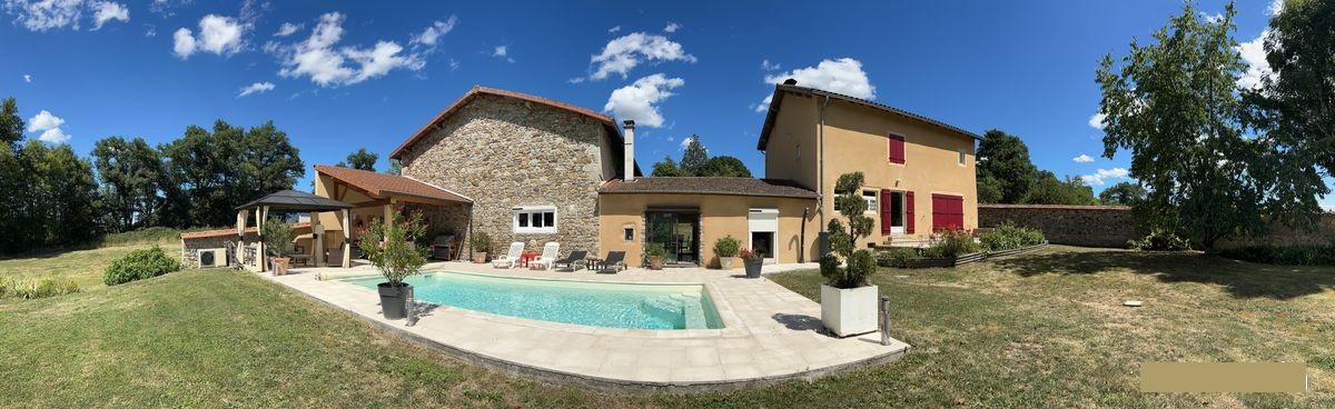 Maison rénovée, 200m² habitables exposée sud Sud-Est. Aucun vis-à-vis, vu dégagé sur les monts du Livradois. 2 km du centre-ville d'Ambert . Grande pièce de vie avec espace bar salon Lecture coin télé et bureau. Une cuisine. Trois chambres. Une salle de bain. Une salle de douche à l'italienne plus buanderie. Trois WC. Chauffage central gaz. Poêle alsacien à bois. Une cave. Deux entrées. Terrain Clos 4000 m². Panneaux photovoltaïques Autoconsommation. Piscine chauffée, pompe à chaleur, nage à contre courant. Bâche à barre. Pool house. Dépendance: garage, atelier et grange à bois, 200 m². Belle prestation.